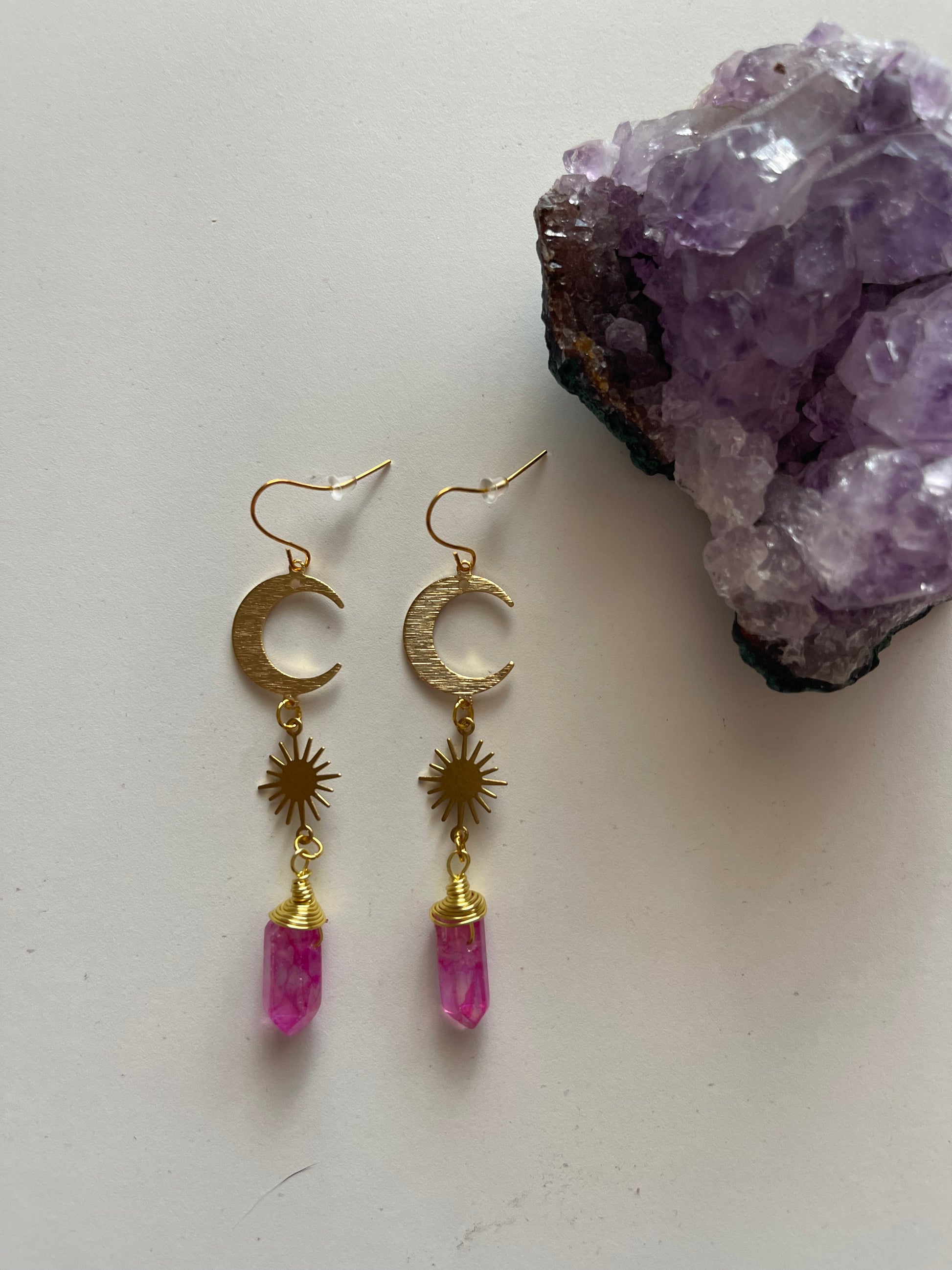 Add a touch of sparkle with this handmade pink quartz drop earring set from Homeroom Gems. Each pair features natural quartz wrapped in gold wire and accented with playful charms like suns, moons, and hammered brass discs. Lightweight and eye-catching, these earrings are the perfect blend of boho and everyday elegance.